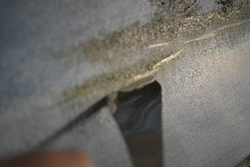 With the help of the knife, I carefully stretch out the color on my makeshift palette as thin as possible and load the knife with a thin roll of paint. To create the sharp silhouette of the mountain, I’m supposed to barely touch the canvas with the knife.