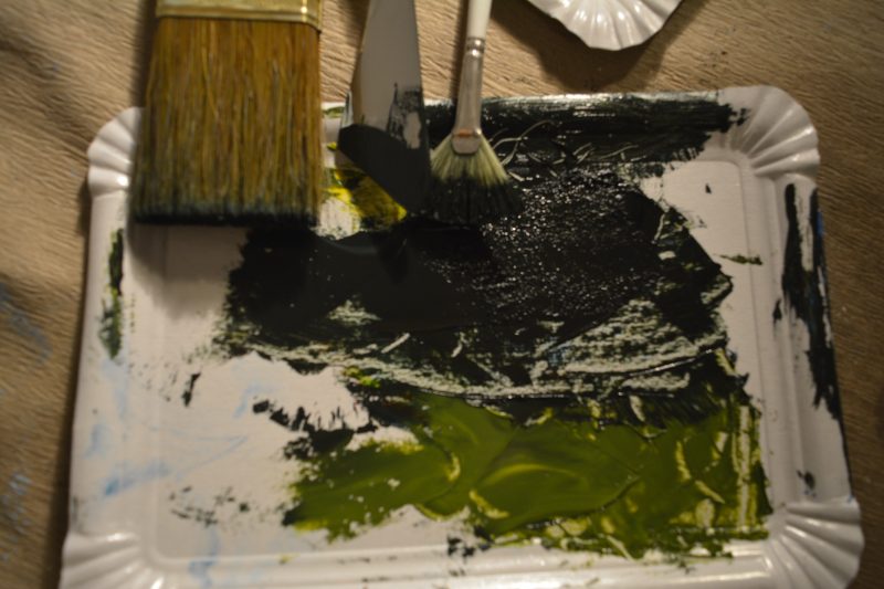 I take a new paper plate as a palette for the now required colors. Not having a proper plastic palette clearly is a disadvantage. The paper plates are not as stable as the color palette used in the tutorial. Consequentially, I can’t keep up with Bob Ross when preparing and blending colors. Also, my workflow feels somewhat hindered by constantly reaching down to my makeshift palette laying on the floor.