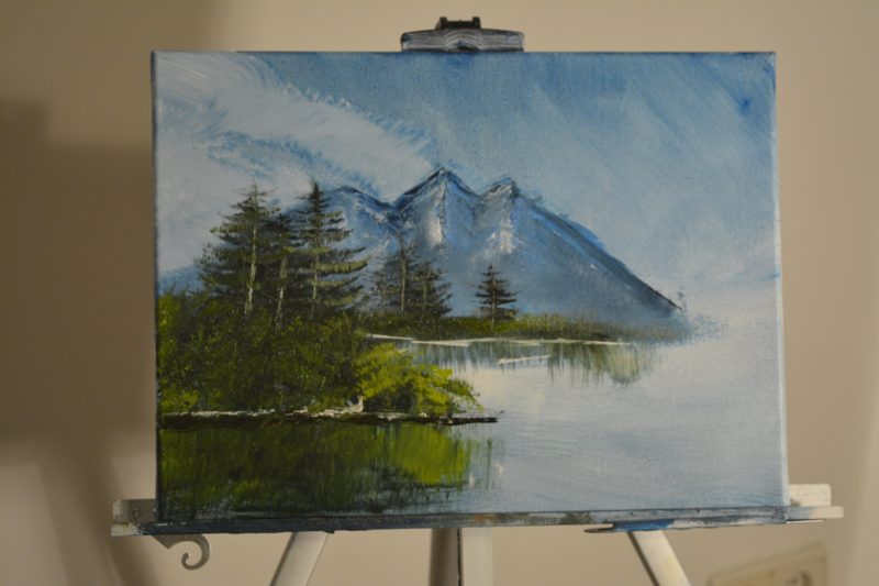 When I started my painting, I went for an exact replica of Bob Ross’ “mountain scene”. Looking back, this is very unlikely and a bit naive, more so for a first-time painter.  I’ve realized quickly I’m not yet able to copy every of Bob Ross’ brush strokes. But that’s not the goal of the exercise.